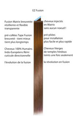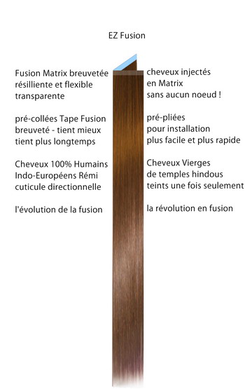 Les Rallonges EZ Fusion sont des plus facile à installer. Une installation peut se faire en moins de 30 minutes. Les Rallonges EZ Fusion tiennent jusqu'à 3 mois, et sont réutilisables jusqu'à 4 fois! Les paquets EZ Fusion contiennent 24 extensions Pré-Pliées de 3" (8cm) de largeur, et 18" (45cm) de longueur, en une ondulation naturelle. Un paquet EZ Fusion suffit pour une installation moyenne.